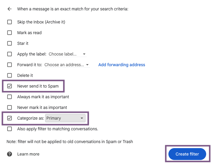 Click “Create filter” to save